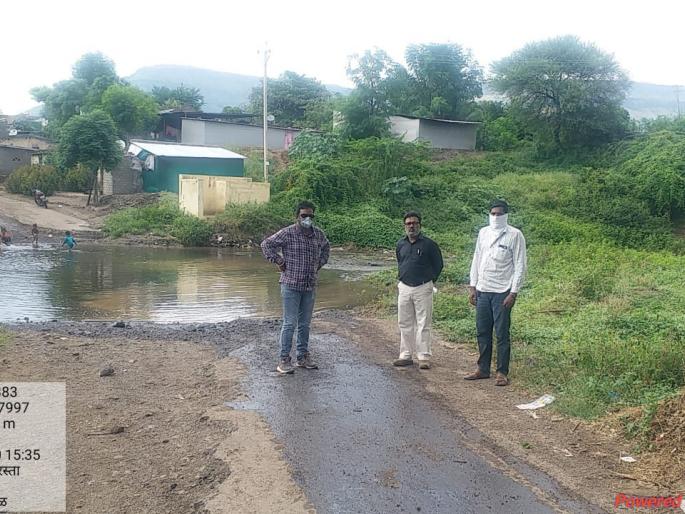 खर्डे आदिवासी वस्ती जवळील रस्त्याची पहाणी करतांना शाखा अभियंता आर बी चव्हाण ,ग्रामविकास अधिकारी योगेश पगार आदी.