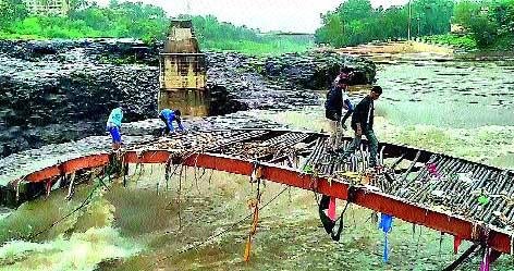 नाशिक : तपोवनमधील गोदावरी-कपिला संगम येथील गोदावरीवरील धोकादायक लोखंडी पुलाची पुराच्या पाण्यामुळे दुर्दशा झाली आहे. तरीदेखील काही तरु ण जीव धोक्यात घालून या पुलावरून नदी ओलांडत असल्याचे चित्र पहावयास मिळत आहे. पावसाची संततधार आणि गंगापूर धरणातून सुरू असलेला विसर्गामुळे नदीच्या पाण्याच्या पातळीत वाढ झाली असून, या पुलावरून जाताना दुर्घटना घडण्याची भीती व्यक्त होत आहे. प्रभू रामचंद्र वनवास काळात शहरातील तपोवनात काही काळ वास्तव्यास होते. या परिसराला धार्मिक पौराणिकदृष्ट्या विशेष महत्त्व असल्याने देशभरातील पर्यटकांची या ठिकाणी कायम वर्दळ असते. पूल ओलांडून टेकडीवर असलेल्या राम, सीता, लक्ष्मण यांच्या प्रतिमेच्या भव्य प्रतिकृतींसोबत सेल्फी काढण्यासासाठी पर्यटक जात असल्याचे येथील विक्रेत्यांचे म्हणणे आहे. या प्रतिकृतींजवळ पोहचण्यासाठी हा लोखंडी पुलाचा एकमेव मार्ग आहे. सध्या नदीच्या पाण्याची पातळी प्रचंड वाढली असून, मागील महिन्यात आलेल्या पुरामुळे या पुलाची दुरवस्था होऊन पुलाचा मार्ग धोकादायक बनला आहे. पुलावर टाकलेले लाकडी बांबूही पाण्याने भिजून कमकुवत झाले आहेत. तर काही लाकडी फळ्या तुटल्या आहेत. याबरोबरच लोखंडी पुलाला असलेल्या साखळ्यांचे संरक्षण ही तुटले आहे. एकूणच या पुलावरून मार्गस्थ होताना कुठलाही आधार राहिलेला नाही. केवळ तोल सांभाळत धाडस करून तरुण ये-जा करताना दिसत आहे. मात्र अनवधानाने लक्ष विचलित होऊन किंवा पाय घसरून तोल गेल्यास दुर्घटना घडण्याची शक्यता नाकारता येत नाही.