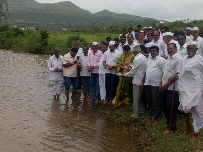 डांगसौंदाणे येथे केळझर धरणावर जलपूजन करताना आमदार दीपिका चव्हाण, संजय चव्हाण व इतर मान्यवर.