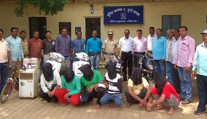 नाशिक : शहरात दरोडा तसेच लुटमार करणाºया टोळीतील सहा संशयितांच्या मुसक्या आवळण्यास शहर गुन्हे शाखेस यश आले आहे़ गुन्हे शाखेच्या युनिट एकने संशयित पवन राजेंद्र वाडेकर (२५, रा. गुरुकृपा हाइट्स, हिरावाडी), वीरेंद्र ऊर्फ बिºया यशपाल शर्मा (३२, रा. पत्रागल्ली, भारतनगर), अजीज ऊर्फ भय्या इशाक शहा (३०, रा. सावित्रीबाई फुलेनगर, वडाळा),आसीफ रज्जाक सैयद (रा. अशोकामार्ग), शादाब सलीम पिरजादे (२३, रा. ममतानगर, अशोकामार्ग), अमीर यामीन ऊर्फ सत्त्या अन्सारी (२५, रा. नानावली, अमरधामरोड, भद्रकाली), या सहा संशयितांना अटक केली आहे़