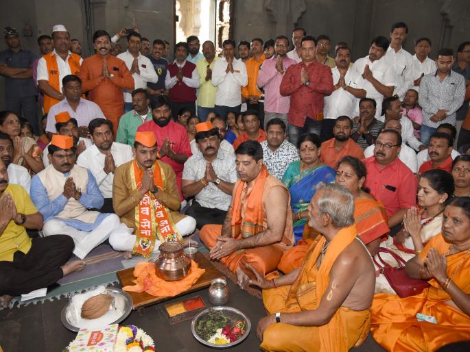 पंचवटी : सियावर रामचंद्र की जय असा जयघोष करीत अयोध्येत प्रभू रामचंद्रांचे मंदिर लवकरात लवकर उभे राहावे यासाठी बुधवारी (दि.२८) सकाळी शेकडो शिवसैनिकांच्या उपस्थितीत पंचवटीतील काळाराम मंदिरात जलाभिषेक व पूजन करण्यात आले. अयोध्येतून आणलेल्या शरयू नदीच्या पाण्याने काळाराम मंदिरात श्रींच्या मूर्तींना शिवसेनेचे संपर्कप्रमुख भाऊसाहेब चौधरी, अजय बोरस्ते व खासदार हेमंत गोडसे यांच्या हस्ते जलाभिषेक करण्यात आला.सकाळी राममंदिरात विधिवत पूजन करण्यात येऊन ब्रह्मवृंदाच्या उपस्थितीत मंत्रोच्चारात जलाभिषेक कार्यक्र म झाला. यावेळी उपस्थित शिवसैनिकांनी हर हिंदू की यही पुकार पाहिले मंदिर फिर सरकार, श्री राम जय राम जय जय राम, सियावर रामचंद्र की जय असा जयघोष केला. यावेळी कार्यकर्त्यांनी भगव्या टोप्या परिधान केल्या होत्या. तर महिलांची संख्याही लक्षणीय होती. सकाळी ८.३० एकत्र आलेल्या कार्यकर्त्यांनी प्रथम मंदिरात प्रदक्षिणा मारून गाभाऱ्यात जलकलशाची विधीवत पुजा करण्यात आली. जलाभिषेक कार्यक्रम प्रसंगी शिवसेना ग्रामीण जिल्हाप्रमुख सुनील पाटील, महानगर प्रमुख महेश बडवे, सचिन मराठे, एडव्होकेट श्यामला दीक्षति, सुवर्णा मटाले, नितीन चिडे, प्रमोद नाथेकर, राजू थेटे, सुनील गोडसे, अमोल सूर्यवंशी, दिलीप दातीर, सुनील गोडसे, योगेश बेलदार, राहुल दराडे, दिलीप मोरे, सुधाकर बडगुजर, सुधाकर जाधव, संगीता जाधव, नयना गांगुर्डे,संतोष गायकवाड, सत्यभामा गाडेकर, पूनम मोगरे, ज्योती देवरे, मंगला भास्कर, उमेश चव्हाण, वैशाली राठोड, मंगला दातीर, योगिता अहेर, शोभा दिवे, गोरख वाघ, देवा जाधव, श्याम कंगले प्रवीण तिदमे, संतोष ठाकूर, बाळासाहेब उगले, संजय चिंचोरे, महेश सोपे, प्रमोद नाथेकार, नाना काळे आदींसह शिवसैनिक उपस्थित होते.