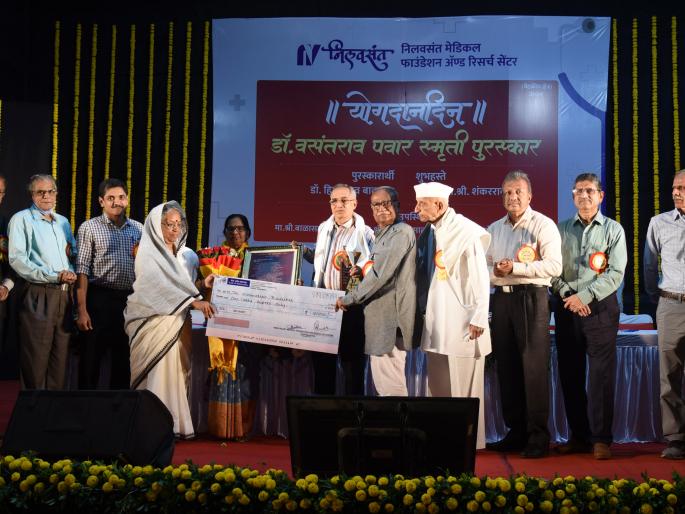 डॉ. हिम्मतराव बावस्कर यांना डॉ. वसंतराव पवार स्मृती पुरस्कार प्रदान करताना बाळासाहेब वाघ, निलीमा पवार, सुरेश पाटील. समवेत डॉ. प्रमोदिनी बावस्कर, वसंत खैरनार, डॉ. व्ही. बी. गायकवाड, डॉ. प्राची पवार व मान्यवर