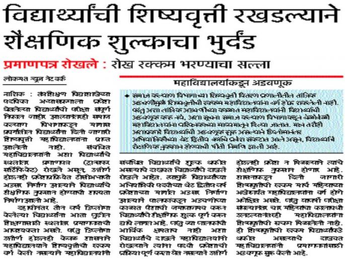 नाशिक : तंत्रशिक्षण विद्याशाखेच्या पदविका अभ्यासक्रमाच्या विद्यार्थ्यांची शिष्यवृत्तीमहाविद्यालयांना प्राप्त झालेली नसल्याने विद्यार्थ्यांचे स्थलांतर प्रमाणपत्र (ट्रान्सफर सर्टिफिकेट) रोखून अडवणूक करून पालकांक डून शैक्षणिक शुल्कांची मागणी करणाºया महाविद्यालयांना कारणे दाखवा नोटिसा बजावण्यात येणार आहे.विद्यार्थ्यांची शिष्यवृत्ती महाविद्यालयांना प्राप्त झालेली नसल्याने महाविद्यालयांकडून विद्यार्थ्यांचे स्थलांतर प्रमाणपत्र (ट्रान्सफर सर्टिफिकेट) रोखून अडवणूक होत असल्याचे वृत्त ‘लोकमत’ने रविवारी (दि.१४) प्रसिद्ध केल्यानंतर समाज कल्याण विभागाने या वृत्ताची गंभीर दखल घेतली आहे़ विद्यार्थ्यांनी तक्रार केल्यास संबंधित महाविद्यालयांना कारणे दाखवा नोटीस बजाविण्यात येणार असल्याची माहिती समाज कल्याण विभागाच्या अधिकारी वैशाली टाके यांनी दिली.तंत्रशिक्षण विद्याशाखेच्या पदविका अभ्यासक्रमाच्या विद्यार्थ्यांना अंतिम परीक्षेत उत्तीर्ण होऊनही अभियांत्रिकीच्या थेट द्वितीय वर्षाच्या प्रवेशप्रक्रियेत टीसीअभावी अडसर निर्माण होत आहे.शासनाने महाविद्यालयांनो शिष्यवृत्तीची रक्कम वर्ग केली नसल्याने महाविद्यालयांनी संबंधित विद्यार्थ्यांचे शुल्क थकीत असल्याचे दाखवत विद्यार्थ्यांचे दाखले रोखले आहेत. त्यामुळे विद्यार्थ्यांच्या अभियांत्रिकी पदवीच्या थेट द्वितीय वर्ष प्रवेशाच्या मार्गात अडसरनिर्माण झाल्याने पालकांकडून अडचणीच्या काळात पैशाची जमावाजमव करून विद्यार्थ्यांचे शैक्षणिक शुल्क पूर्ण करून द्यावे लागत असल्याचे वृत्त लोकमतने प्रसिद्ध केल्यानंतर अशाप्रकारे विद्यार्थ्यांची अडवणूक करणाºया महाविद्यालयांवर कारवाई करण्यात येणार असल्याचे समाज कल्याण विभागाकडून सोमवारी (दि.१५) स्पष्ट करण्यात आले.राष्ट्रवादी विद्यार्थी काँग्रेसचे निवेदनशिष्यवृत्तीस पात्र विद्यार्थ्यांकडून महाविद्यालांनी घेतलेली रक्कम परत करण्याची मागणी करीत राष्ट्रवादी विद्यार्थी काँग्रेसने समाज कल्याण विभागाच्या सहायक आयुक्तांना निवेदन देऊन संबंधित महाविद्यालयांवर कारवाईची मागणी केली. यावेळी सहायक आयुक्तांच्या अनुपस्थित विभागाच्या अधिकारी वैशाली टाके यांनी विद्यार्थ्यांचे निवेदन स्वीकारून यासंदर्भात कारवाई करण्याचे आश्वासन दिले आहे. यावेळी राष्ट्रवादी विद्यार्थी काँग्रेसचे शहर सचिव संकेत गायकवाड, धनंजय भालेराव, चेतन क्षीरसागर, योगेश जाधव यांच्यासह विद्यार्थी उपस्थित होते.शिष्यवृत्ती मिळण्यास उशीर होत असल्याने विद्यार्थ्यांची अडवणूक होऊ नये यासाठी समाज कल्याण विभागातर्फे विशेष परिपत्रक काढण्यात येणार असल्याचे 