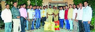 कळवण : येथील समर्थ फ्रेंड्स सर्कलतर्फे शहरात गणेशोत्सव कालावधीत ‘एक मूठ धान्य’ उपक्र म राबविण्यात आला. या उपक्र मात जमा झालेले धान्य कळवण तालुक्यातील कनाशी येथील वनवासी कल्याण आश्रमातील विद्यार्थ्यांना कळवणचे पोलीस निरीक्षक सुजय घाटगे यांच्या प्रमुख उपस्थितीत देण्यात आले.गणेशोत्सव काळात अनेक गणेश मंडळे लाईटिंग, देखावा, मिरवणूक, आतषबाजी आदिंवर हजारो, लाखो रुपये खर्च करतात; मात्र कळवण येथील समर्थ फ्रेंड्स सर्कलने या सर्व बाबींना फाटा देऊन कळवण शहरात गणेशोत्सव काळात गणेश मंडळाच्या पदाधिकारी व सदस्यांनी शहरातील गणेश मंडळे व प्रतिष्ठित नागरिकांकडे जाऊन स्वेच्छेने धान्य भिक्षा देण्याचे आवाहन केले. त्यातून ८ क्विंटल गहू, ८ क्विंटल तांदूळ, २ क्विंटल बाजरी, २ डबे तेल, २० किलो डाळी, १० किलो चहा पावडर, ५० किलो साखर इत्यादि साहित्य जमा करण्यात आले. या सर्व जीवनावश्यक वस्तू कळवणचे पोलीस निरीक्षक सुजय घाटगे यांच्या हस्ते कनाशी येथील वनवासी कल्याण आश्रमाला देण्यात आल्या. यावेळी अभोण्याचे पोलीस उपनिरीक्षक राहुल फुला, सुनील चव्हाण, बबन पाटोळे, समर्थ फ्रेंड्स सर्कलचे स्वप्नील शिरोरे, सागर वाणी, पुष्कर वेढणे, रोहित महाले, मयूर अमृतकार, रोशन कोठावदे, हर्षल मालपुरे, उमेश मुसळे, सचिन गहिवाळ, कल्पेश पाखले, दामोदर अमृतकार, सुभाष देवघरे आदि उपस्थित होते. (वार्ताहर)सार्वजनिक उत्सव जरूर साजरे करावेत; मात्र यावेळी अनावश्यक खर्च टाळून आपण समाजाचे काहीतरी देणे लागतो या भावनेने शक्य तेवढी मदत समाजातील उपेक्षित व गरजू घटकांना करणे ही काळाची गरज आहे. असे अभिनव उपक्रम राबविणाऱ्या गणेश मंडळ सस्थांना सर्व नागरिकांनी सहकार्य करावे. - सुजय घाटगे, पोलीस निरीक्षक, कळवणमागील दोन वर्षांपूर्वी आपल्या समर्थ फ्रेंड सर्कलने असाच अभिनव उपक्र म राबविला होता. त्यावर्षी २५ क्विंटल धान्य जमा झाले. तसेच यावर्षीही जनतेने भरभरून प्रतिसाद दिला व मोलाचे सहकार्य केले.- स्वप्नील शिरोरे, समर्थ फ्रेंड सर्कल, कळवण