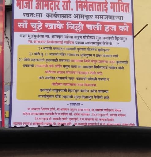 नाशिक : इगतपुरीच्या माजी आमदार निर्मला गावित यांना शिवसेनेतील प्रवेश दिवसागणीक अडचणीत आणणारा ठरत असून, विधानसभा निवडणुकीत त्यांना शिवसेनेकडून मिळणाऱ्या संभाव्य उमेदवारीला ठिकठिकाणी बैठकांमधून होणारा विरोध आता फलकबाजीच्या माध्यमातून रस्त्यांवर येऊन ठेपला आहे. गावित यांच्याकडून विविध कामांबाबत घेतल्या जाणाºया श्रेयाला विरोधकांनी आक्षेप घेत त्यांनी ग्रामस्थांची दिशाभूल केल्याचा आरोप या फलकाद्वारे केला आहे. गावित यांच्याबाबत विरोधाची धार तीव्र बनत चालल्याने शिवसेनेच्या गोटात चिंतेचे ढग जमू लागले असतानाच पक्षाने विरोध डावलून उमेदवारी दिल्यास अडचणी वाढण्याची भीती शिवसैनिकांमधून व्यक्त केली जाऊ लागली आहे.कॉँग्रेसच्या आमदार निर्मला गावित यांनी हाती शिवबंधन बांधत शिवसेनेच्या उमेदवारीवर दावा सांगितला आहे. तेव्हापासून शिवसेनेकडून इच्छुक असलेल्या उमेदवारांसह निष्ठावंत शिवसैनिकांमध्ये अस्वस्थता धुमसत आहे. त्यातूनच इगतपुरी-त्र्यंबक तालुक्यातील तीन माजी आमदारांसह जिल्हा परिेषद आणि पंचायत समित्यांचे काही आजी-माजी पदाधिकारी हे एकवटले जाऊन त्यांनी ठिकठिकाणी बैठकांचा धडाका लावत निर्मला गावितांविरोधात मोहीमच उघडली. गावित यांच्यावर असलेले विविध आरोप लक्षात घेता त्यांना उमेदवारी देऊ नये, यासाठी काही पदाधिकाऱ्यांनी मातोश्रीवर उद्धव ठाकरे यांना साकडेही घातले असल्याचे सांगितले जाते. गावित यांच्या विरोधात गावोगावी बैठका घेतल्या जात असतानाच आता गावितांविरोधातील संघर्ष रस्त्यांवर येऊन ठेपला आहे.सदर फलकाबाबत संबंधित प्रकाशकांनी अनभिज्ञता दर्शविली असली तरी, गेल्या दीड महिन्यापासून गावितांविरोधी सुरू असलेली मोहीम पाहता ही फलकबाजी त्याचाच एक भाग असल्याचे बोलले जात आहे. पोलिसांनी सदर फलक नंतर काढून टाकले असले तरी निर्मला गावित यांच्या विरोधातील ढग अधिक गडद होत चालले असल्याची चिन्हे दिसून येत आहे.शिवसेनेच्या भूमिकेकडे लक्षसध्या सेना-भाजप युतीत एकेका जागेवरून झगडा सुरू असताना शिवसेनेकडून गावितांना पसंती दिल्यास उमेदवारी धोक्यात येण्याची भीती निष्ठावंत शिवसैनिकांमधून व्यक्त केली जात आहे. शिवसेना या सर्व घडामोडींबाबत कशाप्रकारे प्रतिसाद देते याकडे आता सर्वांचे लक्ष लागून आहे.गावित यांनी काही दिवसांपूर्वीच घोटी शहरात पाणीपुरवठा योजनेसह मंदिराच्या सभामंडपाच्या भूमिपूजनाचा कार्यक्रम घेतला होता. यासह शहरातील विविध कामांना आमदार निधी मंजूर नाही आणि शासनाने त्याबाबत कोणताही कार्यादेश जारी केलेला नसतानाही गावित यांच्याकडून ग्रामस्थांची दिशाभूल केली जात असल्याचा आरोप करणारे फलक घोटी शहरात झळकले आहेत. या फलकांवर प्र