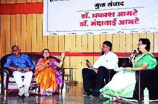 नाशिक : ‘काहीही न बोलता काम करीत राहिलो. कशाचीच अपेक्षा केली नाही. कार्यमग्नतेतूनच अडचणींवर मात केली. त्यातूनच भक्कमपण आले... साधे-सोपे राहिलो, तरी आपल्या आयुष्यावर चित्रपट निघाला, समाजाकडून भरभरून प्रेम मिळते आहे... आणखी काय हवे?’- अशी कृतार्थ भावना ज्येष्ठ समाजसेवक डॉ. प्रकाश व डॉ. मंदाताई आमटे यांनी व्यक्त केली. इंडियन मेडिकल असोसिएशन (आयएमए) व समकालीन प्रकाशन यांच्या संयुक्त विद्यमाने डॉ. आमटे दाम्पत्याशी मुक्त संवादाचा कार्यक्रम कर्मवीर रावसाहेब थोरात सभागृहात झाला, त्यावेळी या दोन्ही सेवाव्रतींनी अनेक विषयांवर मनमोकळी मते मांडली. डॉ. शशांक कुलकर्णी व डॉ. नीरजा कणीकर यांनी त्यांची मुलाखत घेतली. बाबा आमटे यांचे संस्कार, हेमलकसा प्रकल्प, तेथील सोयी-सुविधा, मुलांचे विवाह, आदिवासींची जीवनपद्धती, समाजाचा दृष्टिकोन अशा अनेक विषयांना मुलाखतीतून स्पर्श करण्यात आला. डॉ. प्रकाश आमटे म्हणाले की, सुरुवातीच्या काळात आदिवासींचे दु:ख जाऊन त्यांच्या चेहऱ्यावर फुललेला आनंद हीच कामाची ऊर्जा होती. आदिवासींचा आमच्यावर विश्वास बसत नव्हता; पण त्या काळाला ‘खडतर’ म्हणणे चुकीचे ठरेल. कारण ते सारे आम्ही स्वत:हून स्वीकारले होते. दोघांनी मिळून निर्णय घेतले. सुख-दु:खे ‘शेअर’ करू शकत नव्हतो. त्यामुळे संयम शिकलो. आता आमची तिसरी पिढी आदिवासींसाठी झोकून देऊन काम करीत आहे. हेमलकसा प्रकल्पाच्या शाळेतील मुले डॉक्टर, इंजिनिअर होऊ लागली आहेत. तेथे अत्याधुनिक वैद्यकीय सुविधा उपलब्ध झाल्या आहेत. यात आम्ही निमित्तमात्र असून, समाजाच्या पाठिंब्यामुळेच हे होऊ शकले. डॉ. मंदाताई यांनी सांगितले की, प्रारंभी लोकांचा आमच्यावर विश्वास बसत नसल्याने नैराश्य यायचे. कोणी बोलायलाच नसल्याने आमचे एकमेकांशी चांगले ‘ट्यूनिंग’ जमले. आदिवासींची भाषा शिकलो. कामात वेळ घालवल्याने जीवन कंटाळवाणे झाले नाही. आदिवासींचे स्त्रीजीवन, तेथील विवाहाच्या प्रथा-परंपरा यावरही त्यांनी प्रकाश टाकला. सुमारे दीड तास हा कार्यक्रम सुरू होता. समकालीन प्रकाशनाचे आनंद अवधानी यांनी प्रास्ताविक केले. आमटे यांच्यातील डॉक्टर समजावून घेण्यासाठी हा कार्यक्रम आयोजित केल्याचे ते म्हणाले. डॉ. मंगेश थेटे यांनी सूत्रसंचालन केले. ज्येष्ठ नेते विनायकदादा पाटील, मविप्रच्या सरचिटणीस नीलिमा पवार, आमदार तथा ‘आयएमए’चे अध्यक्ष डॉ. राहुल अहेर यांच्या हस्ते आमटे दाम्पत्याचा सत्कार करण्यात आला. डॉ. सुहास कुलकर्णी, मुक्ता चैतन्य, डॉ. अनिरुद्ध भांडारकर, डॉ. आवेश पलोड आदि व्यासपीठावर उपस्थित होते.