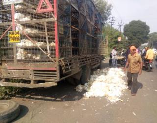 कोंबड्यांची वाहतूक करणारा ट्रक उलटल्याने ४००कोंबड्या मृत्यूमुखी