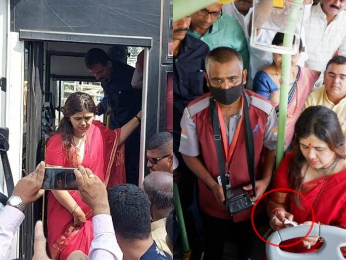 नाशिक - भाजपच्या राष्ट्रीय सचिव पंकजा मुंडे यांनी आज सकाळी अचानकपणे शहरातील सिटी बसमधून प्रवास करत सर्वानाच आश्चर्यचकित केले. विशेष म्हणजे त्यांनी स्वत: तिकीट काढून हा प्रवास केला. त्यामुळे, त्यांच्यासमवेत असणारे आमदार, महापौर आणि कार्यकर्तेही अवाक् झाले. तर, सिटी बसमधील तिकीट कंडक्टरलाही पंकजा मुंडेच्या या साधेपणाचे आश्चर्य वाटले.