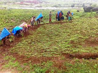 पेठ : तब्बल तीन आठवड्याच्या प्रतिक्षेनंतर तालुक्यात पावसाने समसधानकारक प्रारंभ केल्याने दुष्काळाच्या खाईत लोटल्या जाणाऱ्या बळिराजाला थोडापार दिलासा मिळाला असून उशिराने का होईना पए सद्वा तालुक्यात भातासह नागलीची लावणी जोरात सुरू झाली असून यामुळे मजूरांचा मोठ्या प्रमाणावर तुटवडा जाणवत आहे़यावर्षी पावसाने सुरूवातीलाच दडी मारल्याने आदिवासी भागातील शेतकऱ्यांना दुबार रोप पेरणीचा सामना करावा लागला़ दुसरीकडे आषाढी एकादयीनंतर पाऊस सक्रिय झाला खरा पण रोपच नसल्याने आता काय करावे अशा विवंचनेत शेतकरी सापडला़तशाही परिस्थितीत हाताला येईल ते रोप उनटून येतकऱ्यांनी लावणीला सुरूवात केली़दरवर्षी लावणी करून विठ्ठलाच्या दर्शनाला पंढरीला जाणारा आदिवासी भागातील शेतकरी यावेळी मात्र शेतीकामातच मग्न राहिला़ सुरूवातील भाताची लागवड पूर्ण झाल्यावर मग नागलीची लागवड करण्याची पध्दत असतांना निसर्गाच्या लहरीपणामुळे यावेळी भातासह नागलीचीही लागवड उरकवण्याच्या स्थितीत शेतकरी पाहवयास मिळत आहे़ सद्या सर्वत्र भाताची खाचरे पाण्याने तुंडूंब भरली असल्याने लावणीला योग्य वातावरण असल्याचे शेतकरी सांगतात़ तर नागलीला जास्त पावसाची गरज नसल्याने डोंगरउतारावर नागलीची लागवड करतांना शेतकरी दिसून येतात़