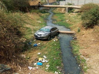 पाईपलाईन रस्त्यावरील नाल्यात कोसळली कार
