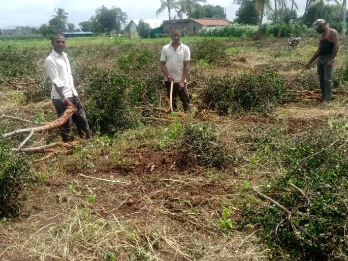 येवला तालुक्यातील पाटोदा येंथे डाळिंबबागा तोडताना शेतकरी.