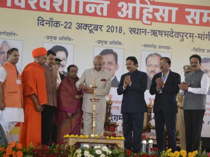 मांगीतुंगी (नाशिक)- बागलाण तालुक्यातील मांगीतुंगी येथे विश्वशांती अहिंसा संमेलनाचे उद्घाटन राष्ट्रपती रामनाथ कोविंद यांच्या हस्ते करण्यात आले. यावेळी मान्यवरांच्या हस्ते दीपप्रज्वलन करण्यात आले.