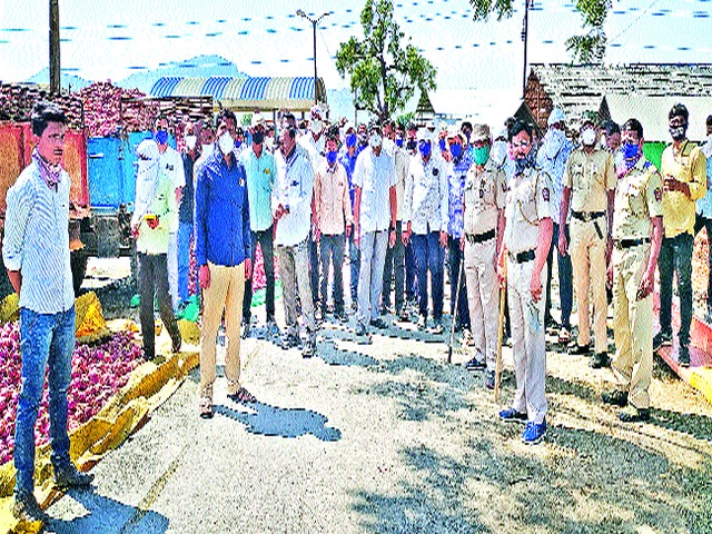 देवळा बाजार समितीत पोलीस बंदोबस्तात कांद्याचे लिलाव सुरू झाले. त्यावेळी कांदा व्यापारी, शेतकरी व पोलीस कर्मचारी.