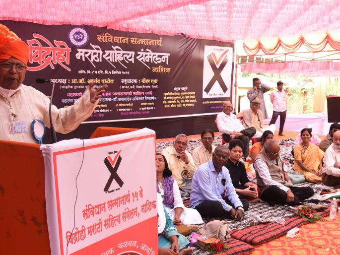 नाशिक येथील अभिनव बालमंदिर विद्यालयाच्या प्रांगणात उभारलेल्या वामनदादा कर्डक साहित्य नगरीत संविधान सन्मानार्थ १५ व्या विद्रोही साहित्य संमेलनाचे उद्घाटन शनिवारी (दि. ५) झाले. याप्रसंगी डॉ. पाटील बोलत होते. आपल्या भाषणात त्यांनी अनेक आंतरराष्ट्रीय लेखकांच्या शोधनिबंधांचे आणि लेखकांचे दाखले देत मराठी साहित्यातील सांस्कृतिक घोटाळे उघड करीत कळपबाजीने मराठी साहित्य व संस्कृतीला परंपरावाद्यांचे हस्तक बनलेल्यांनी किती हानी पोहोचविली आहे याचा लेखाजोखा मांडला. आपल्या उद्घाटनपर भाषणात ज्येष्ठ शास्त्रज्ञ, कवी लेखक डॉ. गोहर रझा यांनी दलित साहित्यिकांनी आपली जबाबदारी ओळखून नव भारताचे स्वप्न पाहायला हवे, विद्रोही साहित्य संमेलन प्रत्येक जिल्ह्यात व्हावीच, त्याचबरोबर परराज्यांमधील किमान राजधानीच्या शहरांमध्ये भरायला हवीत, असे मत व्यक्त केले. आपल्या भाषणात त्यांनी केंद्र सरकारवर सडकून टीका केली. चुकीची वक्तव्ये करून भारताची प्रतिमा बदलण्याचा प्रयत्न पंतप्रधानांकडून होत आहे. त्यांच्या भाषणाला मोठ्या प्रमाणात टाळ्या पडतात, पण त्यांना विरोध करण्याची कुणाचीही हिंमत होत नाही, हे गंभीर आहे. ते जे बोलतात तेच राज्यांचे मुख्यमंत्री, न्यायाधीश आणि शिक्षणमंत्रीही बोलतात. गोमूत्र तपासण्यासाठी आयआयटीमध्ये संशोधन केले जावे असे सांगणारा पंतप्रधान नसावा, असेही ते म्हणाले. संयोजन समितीच्या राज्य अध्यक्ष प्रा. प्रतिमा परदेशी आणि स्वागताध्यक्ष शशिकांत उन्हवणे, मविप्रचे शिक्षणाधिकारी एस. के. शिंदे यांचीही यावेळी भाषणे झाली.