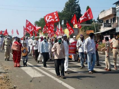 नाशिक : केंद्र सरकारने शेतकरी, कामगार विरोधी कायदे, प्रस्तावित वीज विधेयक रद्द करावे, गरजु कुटुंबाला सहा महिने दरडोई १० किलो धान्य मोफत द्यावे, कोरोनापासून सुटका करण्यासाठी सार्वजनिक आरोग्य व्यवस्था बळकट करावी विविध मागण्यांसाठी मार्क्सवादी कम्युनिस्ट पक्षाच्या नाशिक तालुका कमिटी, अखिल भारतीय किसान सभेने एल्गार पुकारला. गुरुवारी (दि.२६) लाल बावटे घेत शेतकरी, कामगार घटकातील आंदोलकांनी नाशिक-त्र्यंबकेश्वर रस्ता दुतर्फा रोखून धरला.