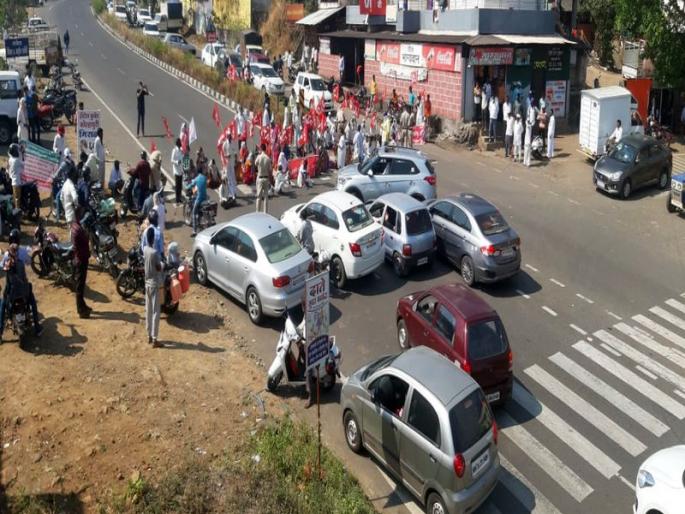 नाशिक : केंद्र सरकारने शेतकरी, कामगार विरोधी कायदे, प्रस्तावित वीज विधेयक रद्द करावे, गरजु कुटुंबाला सहा महिने दरडोई १० किलो धान्य मोफत द्यावे, कोरोनापासून सुटका करण्यासाठी सार्वजनिक आरोग्य व्यवस्था बळकट करावी विविध मागण्यांसाठी मार्क्सवादी कम्युनिस्ट पक्षाच्या नाशिक तालुका कमिटी, अखिल भारतीय किसान सभेने एल्गार पुकारला. गुरुवारी (दि.२६) लाल बावटे घेत शेतकरी, कामगार घटकातील आंदोलकांनी नाशिक-त्र्यंबकेश्वर रस्ता दुतर्फा रोखून धरला.भाजपा सरकारच्या शेतकरी-कामगारविरोधी धोरणे हाणून पाडण्यासाठी रास्ता रोकोची हाक देण्यात आली होती. कम्युनिस्ट पक्ष व किसान सभेने पुकारलेल्या या आंदोलनाला चांगलाच प्रतिसाद लाभला. केंद्र सरकारविरोधी घोषणाबाजी करत आंदोलकांनी महिरावणी गावाजवळील चौफुलीवर दुपारी साडेबारा वाजेच्या सुमारास रास्ता रोको सुरु केला. त्र्यंबकेश्वर रस्त्याच्या दुतर्फा आंदोलकांनी ठिय्या मांडल्यामुळे नाशिक-त्र्यंबक-नाशिक या मार्गावरील वाहतुक पुर्णपणे ठप्प झाली होती. नाशिककडून त्र्यंबकेश्वरकडे जाणारी वाहतुक सातपूरकडून गिरणारेमार्गे वळविण्यात आली होती. तसेच नाशिककडे येणारी वाहतुक त्र्यंबकरोडवरून पहिने-पेगलवाडीजवळून रोहिलेमार्गे रवाना करण्यात आली. सुमारे तासभर आंदोलकांनी वाट अडवून जोरदार घोषणाबाजी केली. तासाभरानंतर पोलिसांनी मात्र आंदोलकांना त्वरित हटविण्यास सुरुवात करत वाहतूक सुरळीत केली.