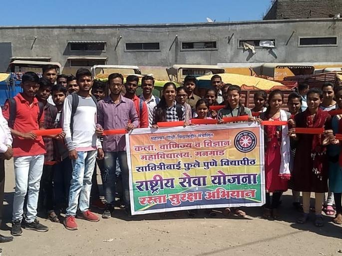 कार्यक्र माचा शुभारंभ प्राचार्य डॉ. बी. एस. जगदाळे व मनमाड पोलिस स्टेशनचे पवार यांच्या उपस्थितीत झाला. बाजार समिती परिसरामध्ये नेहमी कांद्याच्या ट्रॅक्टरची वर्दळ असते. अशा ट्रॅक्टर व अन्य वाहनांना रा.से.यो. स्वयंसेवकांमार्फत रस्ता सुरक्षा संदर्भातले रेडियम लावण्यात आले. यावेळी विविध घोषणांनी रस्ता सुरक्षा संदर्भात जनजागृती करण्यात आली. याप्रसंगी रा. से. यो. कार्यक्र म अधिकारी डॉ. पी. बी . परदेशी, प्रा . एन. ए. पाटील, प्रा. वर्षाराणी पेढेकर व योगेश सोन्नर आदिंसह प्राध्यापकवृंद व विद्यार्थी उपस्थित होते.
