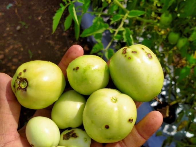 जळगाव नेऊर परिसरात जिवाणूजन्य करपा रोगाने टोमॅटोला पडलेले काळे डाग.