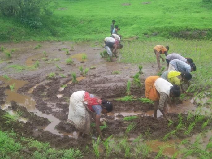 देवगाव : जून महिन्याच्या सुरुवातीला मुसळधार पाऊस कोसळल्यानंतर पावसाने बरेच दिवस दडी मारली होती. त्यामुळे खरीप हंगाम वाया जाण्याच्या भीतीने शेतकऱ्यांच्या तोंडचे पाणी पळाले होते. रोहिणींच्या सरीने बळीराजाला दिलासा मिळून त्या जोरावर शेतकऱ्यांनी भात, नागली वरईची पेरणी केली. मात्र, पुढील पावसाचे एकही नक्षत्र समाधानकारक न कोसळल्याने शेतकरी संकटात सापडला होता. मात्र, जुलैच्या दुसऱ्या आठवड्यापासूनच रिपरिप व मध्यम स्वरूपाच्या बरसणाऱ्या पावसामुळे त्र्यंबकेश्वर तालुक्यातील शेतकरी समाधानी झाले आहेत.तीन-चार दिवसांपासून सुरू असलेल्या पावसामुळे शेतकऱ्यांनी आवणीच्या कामाला सुरुवात केली आहे. मात्र, कोरोनाच्या भीतीने व सगळ्यांनीच एकदाच शेतीकामांना सुरुवात केल्याने अनेक शेतकऱ्यांना मजूरच मिळत नसल्याने शेतीची कामे काहीशा संथ गतीने सुरू आहेत. वेळेत मजूर न मिळाल्यास भात लावणीची कामे रखडून रोपांचे नुकसान होण्याची चिंता बळीराजा करत आहे. म्हणून घरातील उपलब्ध मनुष्यबळाचा वापर करून आवणीची कामे शेतकऱ्यांनी सुरू केली आहेत.त्र्यंबकेश्वर तालुक्यातील देवगावसह परिसरातील वावीहर्षे, टाकेदेवगाव, येल्याचीमेट, श्रीघाट,चंद्राचीमेट, डहाळेवाडी, टाकेहर्षे या भागात मध्यम स्वरूपाच्या पावसामुळे आवणीच्या कामाला सुरुवात झाली असून, मजूरटंचाईमुळे शेतीच्या कामांना ब्रेक लागला आहे. इगतपुरी तालुक्यातील नांदडगाव, वांजळे, कोरोळे या भागातून शेतकरी देवगाव परिसरातील वाडीपाड्यांमधील मजूर घेऊन जात असल्यामुळे मजुरांची उणीव भासत आहे. त्यात दरवर्षीच्या तुलनेत मजुरीवाढ केल्याने बळीराजा चिंतित आहे. मजुरांचा दरदिवसाला २५० रुपये रोज होता; परंतू, लॉकडाऊनच्या काळात मजूर मिळत नसल्याने ३०० रुपये मजुरांची मजुरी झाली आहे. ग्रामीण भागातील शेतकरी मजुरीवाढीने हवालदिल झाला असून घरच्या उपलब्ध मनुष्यबळाच्या साहाय्याने शेतीकामांवर जोर दिला आहे.बऱ्याच दिवसांपासून पावसाने दडी मारल्याने लावणीची कामे खोळंबली होती. मात्र, आता काहीसा समाधानकारक पाऊस होत असल्यामुळे सर्वच शेतकऱ्यांनी लावणीची कामे हाती घेतल्यामुळे मजुरांची कमतरता भासत आहे. त्यामुळे घरातील उपलब्ध मनुष्यबळावर लावणीचे काम हाती घेतले आहे.- खंडू देहाडे, शेतकरी, अस्वलीहर्ष