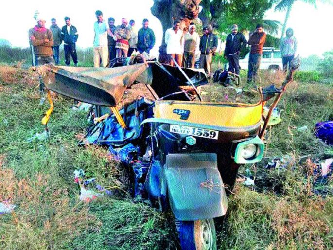 शहरातील यात्रोत्सवात खेळणी, पानठेला, घरगुती वापराचे साहित्य विक्री करणारे सातजण गेल्या मंगळवारी माल खरेदीसाठी मुंबईला गेले होते. बुधवारी माल खरेदी करून ते आरामबसने गुरुवारी पहाटे मालेगावला आले. मालेगावहून या व्यावसायिकांनी सकाळी पावणेसहा वाजेच्या सुमारास संजय पंधाडे यांची रिक्षा (क्र. एमएच ४१ व्ही १५५९) भाड्याने केली. मालेगावहून सटाण्याकडे येत असताना आराई पांधीनजीकच्या सुकड नाल्याच्या वळणावर समोरून बेदरकारपणे येणाºया अज्ञात कंटेनरने रिक्षाला जबरदस्त अज्ञात कंटेनरने धडक दिल्याने झालेल्या दुर्घटनेत रिक्षाचा चक्काचूर झाला. यात रिक्षाचालकासह सातही जण जागीच ठार झाले. दुर्घटना घडल्यानंतर येथील रुग्णवाहिकाचालक कल्पेश निकम मालेगावकडे जात असताना त्यांना अपघातातील मृतदेह दिसले. त्यांनी तत्काळ पोलीस ठाण्याशी संपर्क साधून घटनेची माहिती दिली. पोलीस निरीक्षक हिरालाल पाटील, उपनिरीक्षक कृष्णा घायवट, बाळासाहेब पाटील आणि पोलीस कर्मचाºयांनी तत्काळ मदतकार्य सुरू करून रिक्षाचालकासह अपघातग्रस्तांना येथील ग्रामीण रुग्णालयात हलविण्यात आले. मात्र उपचारापूर्वीच त्यांचा मृत्यू झाल्याचे वैद्यकीय सूत्रांनी सांगितले.