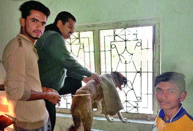 जळगाव निंबायती : पिसाळलेल्या बैलाला जेसीबीच्या साहाय्याने निर्दयपणे जीवे मारणाऱ्या माथेफिरूंचे वृत्त काही दिवसांपूर्वी दूरदर्शनवर आले होते. मुक्या प्राण्यांचा अमानुषपणे छळ करून त्यांचे हाल करणारी माणसे जशी आपल्याला पाहायला मिळतात तशीच या प्राण्यांची काळजी घेऊन त्यांच्यावर कोसळलेल्या संकटातून त्यांची सुटका करणारी माणसेही या जगात आहेत. याच गोष्टीचा प्रत्यय देणारी घटना तालुक्यातील जळगाव निंबायती येथील गो. य. पाटील कनिष्ठ महाविद्यालयात अनुभवायला मिळाली.भटक्या श्वानांच्या भांडणात जखमी अवस्थेतील एका श्वानाने गो. य. पाटील विद्यालयाच्या एक वर्गखोलीत आश्रय घेतला. थंडीपासून व इतर श्वानांपासून बचावासाठी नकळतपणे येऊन लपलेले हे श्वान कोणाच्याही निदर्शनास आले नाही. शाळा सुटली तसे विद्यार्थी व शिक्षक वर्गखोल्या बंद करून घरी गेले. बाहेर निघण्याचा प्रयत्नात श्वानाची खिडकीच्या लोखंडी चौकटीत मान पूर्ती अडकली, त्याने खूप झटापट करून निघण्याचा आटोकाट प्रयत्न केला, मात्र त्याचे हे प्रयत्न अपयशी ठरले. तद्नंतर त्याने जोरजोरात भुंकण्यास सुरु वात केली.मात्र रात्रीच्या वेळी घडलेला प्रकार कोणाच्याही लक्षात आला नाही. सकाळच्या सुमारास कनिष्ठ महाविद्यालयाचे विद्यार्थी वर्गखोलीत आले असता सदर प्रकार त्यांच्या निदर्शनास आला. बघ्यांची मोठीगर्दी झाली होती. अशावेळी सौरभ शिंदे व त्याचा मित्र सतीश कोरे, आशिष ढोणे, शुभम पवार, विशाल कांबळे व संदीप घुगे यांनी सुटकेसाठी जिवाचा आटापिटा करून विव्हळत असलेल्या श्वानाला लोखंडी चौकटीतून बाहेर काढण्याचाप्रयत्न केला, मात्र श्वानाचे डोके चौकटीतील मधल्या भागात अडकल्यामुळे त्यांचे सर्व प्रयत्न निष्फळ ठरत होते. शिवाय रात्रभर सुटकेचा प्रयत्न करणारा श्वान चावा घेण्याची शक्यता होती.यावेळी प्राध्यापक अमोल आहिरे यांच्या मार्गदर्शनाखाली गावातून हॅक्सॉ ब्लेड आणण्यात आले व अतिशय सावधगिरीने श्वानाला कुठलीही इजा न होऊ देता, तसेच विद्यार्थ्यांची सुरक्षितता विचारात घेता त्या खिडकीची लोखंडी चौकट हळूहळू कापण्यात आली. जवळपास दोन तासांच्या अथक परिश्रमानंतर त्या जखमी अवस्थेतल्या श्वानाची सुखरूप सुटका झाली. श्वानाने एकच पळ काढल्याने सर्वांचा जीव भांड्यात पडला.पाटील विद्यालयाच्या एक वर्गखोलीत खिडकीच्या जाळीतील लोखंडी चौकटीत श्वानाची मान अडकली होती. विद्यार्थ्यांनी सावधगिरीने श्वानाला कुठलीही इजा न होऊ देता, खिडकीची लोखंडी चौकट हळूहळू कापली व कुत्र्याची सुखरुप सुटका झाली. विद्यार्थ्यांनी दाखविलेल्या या धाडसाचे संस्था अध्यक्ष कासूताई पाटील, सचिव महेंद्र पाटील, निंबाजी शिंदे, प्राचार्य जी. एस. फसाले, प्रा. पी. जी. माने, ए