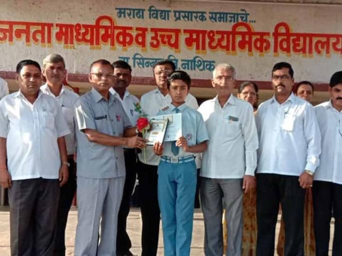 विद्यालयातील इयत्ता सहावीत शिकणाऱ्या आदित्य मोहन माळी याने जिल्हयात तृतीय क्रमांक पटकावला. मराठा विद्या प्रसारक समाज संस्था नाशिक यांच्या सहकार्याने गांधी रिसर्च फाउंडेशन जळगाव यांच्यावतीने गांधी विचार संस्कार परीक्षेचे जिल्ह्यात आयोजन करण्यात आले होते. त्याला ब्रांझ पदक व प्रशस्तीपत्रक देऊन गौरविण्यात आले. वर्गशिक्षक श्रीमती एस. एस. पगार, परीक्षा केंद्र समन्वयक एन. पी. माळी यांचे मार्गदर्शन लाभले. माळी याचे कौतुक मराठा विद्या प्रसारक समाज संस्थेचे संचालक हेमंत नाना वाजे,शालेय समितीचे अध्यक्ष नारायण वाजे, उच्च माध्यमिक समितीचे अध्यक्ष विठ्ठलराव वामने, विद्यालयाचे प्राचार्य एस. बी. येवले यांनी केले आहे. प्राचार्य येवले,पर्यवेक्षक पी. टी. जाधव यांच्या हस्ते सत्कार करण्यात आला.