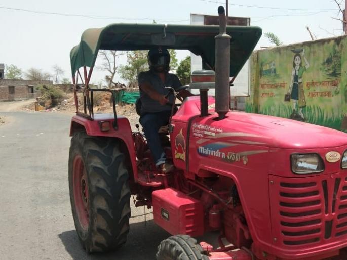 उन्हाच्या झळांचा संरक्षणासाठी हेल्मेट वापर करु न टॅक्टर चालवितांना.