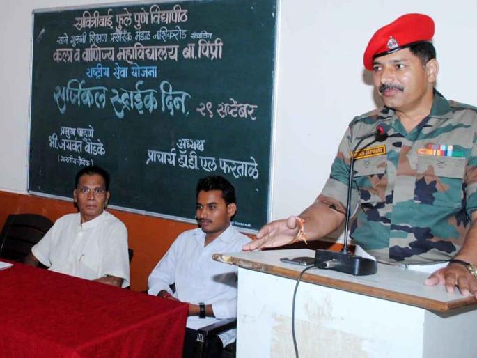 व्यासपीठावर भारतीय सैन्यदलात कार्यरत असलेले अधिकारी जयवंत बोडके, वडझिरे महाविद्यालयाचे प्राचार्य डॉ. डी. एल. फरताळे, राष्ट्रीय सेवा योजना अधिकारी संदीप कापडी, विद्यार्थी विकास अधिकारी किरण सोनवणे उपस्थित होते. बोडके २३ वर्षांपासून आर्मीत कार्यरत आहेत. त्यांनी सर्जिकल स्ट्राईक दिवसानिमित्त विद्यार्थ्यांशी संवाद साधला. सर्जिकल स्ट्राईक हे देशाच्या सार्वभौमत्वासाठी व सैन्यदलासाठी प्रोत्साहन असल्याचे मत व्यक्त केले. १८ सप्टेंबर २०१६ रोजी काश्मीर भागात आतंकवादी भ्याड हल्ला झाला होता, त्याचे प्रत्युत्तर म्हणून भारताने २९ सप्टेंबर २०१६ रोजी सर्जिकल स्ट्राईक केले होते यासह सैन्यभरती प्रक्रियेबद्दलची माहिती बोडके यांनी दिली. प्राचार्य फरताळे यांनी भारतीय सैन्याबद्दल अभिमान व्यक्त केला. याप्रसंगी सुजित हंडोर, वृषाली उगले, संदीप पगार, अर्चना सावंत, गोरक्षनाथ पगार व प्राध्यापकेतर कर्मचारी उपस्थित होते. सुजाता डावखर यांनी सूत्रसंचालन तर ललित गांगुर्डे यांनी आभार मानले.