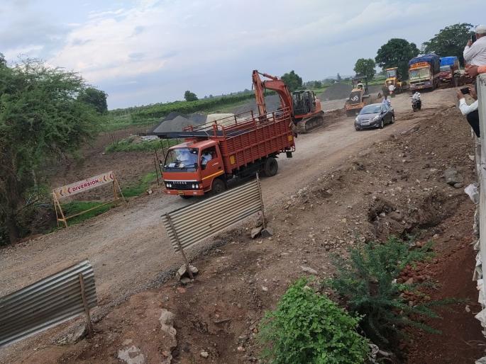 वणी, बोरगाव, सापुतारा, वघई, वासदा, सुरत या रस्त्याचे चौपदरी करणाचे काम सुरू असून भितबारी ते धनाई मातावणी पर्यत रस्त्याचे कुठे ऐकेरी तर कुठे दोन्ही बाजू वाहतूकीसाठी खुल्या करण्यात आल्या असून दोन ठिकाणी पुलाचे काम सुरु असतांना रविवारी (दि.१४) सायंकांळी सप्तश्रृंगी गडावर व अहिवंतवाडी गड परिसरात जोरदार पाऊस झाल्यामुळे पांडाणे येथील पुलाच्या बांधकामासाठी पर्यायी केलेला कच्चा मातीचा रस्ता वाहून गेल्यामुळे गुजरात व महाराष्ट्र अश्या दोन राज्याचा संपर्क तुटला. बातमी सर्वत्र पसरताच विधानसभा उपाध्यक्ष तथा दिंडोरी-पेठचे आमदार नरहरी झिरवाळ, तहसिलदार पंकज पवार, तालुका कृषी अधिकारी अभिजीत जमधडे, राष्ट्रीय महामार्गाचे उपअभियंता मनोज पाटील यांनी त्वरीत पुलाची पहाणी करु न त्वरीत रस्ता वाहतुकीसाठी सुरू करण्याच्या सुचना दिल्या होत्या. त्यानंतर कामाला सुरवात करण्यात आली. परंतू ठेकेदारांकडील अपुऱ्या सामुग्रीमुळे बंद होते. त्यानंतर बुधवारी (दि.१७) पूर्ण दिवस काम करुन अखेर रस्त्याच्या चार ठिकाणी मोठ मोठ्या मोºया टाकून शेवटी रस्ता वाहतूकीसाठी मोकळा करुन देण्यात आला.