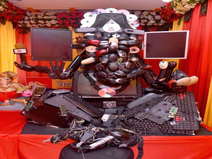 ठळक मुद्देई-कचऱ्याच्या माध्यमातून नऊ फुटी बाप्पाची मुर्ती वर्तमानपत्रांच्या माध्यामातून गणपती साकारले. खराट्यांपासून गणरायांचे रुप साकारुन स्वच्छतेचा संदेश देण्याचा प्रयत्न