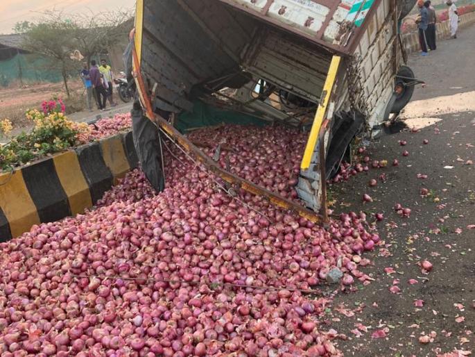 कांद्याने भरलेल्या वाहनाने भररस्त्यावर घेतली पलटी