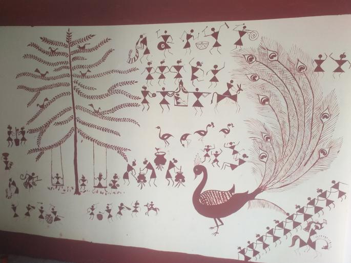 समाज मंदिराच्या भिंतीवर रेखाटली वारली संस्कृती चित्रे