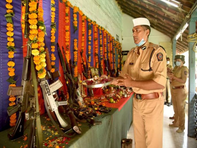 पाण्डेय यांनी विधिवत पूजन करत शस्त्रांचे औंक्षण केले. यावेळी उपायुक्त पौर्णिमा चौगुले, सहायक आयुक्त सिताराम गायकवाड यांनीही शस्त्रांना पुष्पांजली वाहिली. यावेळी उपिस्थत पुरोहितांनी विविध मंत्रोच्चार करत शंखध्वनी वाजविला.