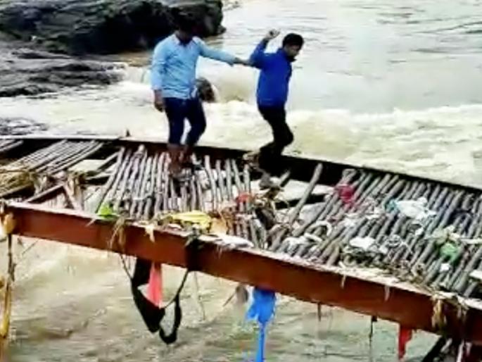 नाशिक, दि. 28- धार्मिक पर्यटन स्थळ व प्रभू रामचंद्र यांचं वनवास काळातील वास्तव्य असलेल्या तपोवनमधील गोदावरी-कपिला संगम येथे धोकादायक लोखंडी पुलावरून काही तरुण जीवघेणा प्रवास करत असल्याचं बघायला मिळतं आहे. पुराच्या पाण्यामुळे दूरावस्था झालेल्या या पुलावरून प्रवास करून सेल्फी काढण्याचा प्रयत्नही या तरूणांकडून केला जातो आहे. त्यामुळे आधीच वाईट परिस्थितीत असलेला हा पूर कोसळून दुर्घटना घडण्याची भीती व्यक्त होत आहे.