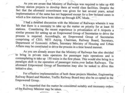 अमिताभ कांत यांनी रेल्वे बोर्डाचे अध्यक्ष विके यादव यांना पत्र लिहले असून त्यामध्ये देशातील 150 रेल्वे गाड्यांचे खासगीकरण करण्याचं सूचवलं आहे. रेल्वे विभागाला 400 निवडक रेल्वे स्थानकांना फर्स्ट क्लास बनवायचं होतं. पण, गेल्या अनेक वर्षांपासून याबाबत प्रयत्न सुरू असले तरी, जेथे ईपीसी मोडद्वारे काम झाले आहे, त्या काही ठराविक घटकांना सोडलं तर अद्यापही काम सुरू झालं नाही.