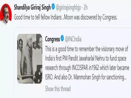 काँग्रेसनं नेहरु आणि मनमोहन सिंग यांचा संदर्भ देत केलेल्या खोचक टीकेला भाजपा नेते गिरीराज सिंह यांनी उत्तर दिलं. 'चंद्राचा शोधदेखील काँग्रेसनंच लावला होता, हे देशाला सांगण्याची हीच वेळ आहे,' अशी कोपरखळी सिंह यांनी मारली. सिंह अनेकदा त्यांच्या विधानांमुळे चर्चेत राहिले आहेत. काही दिवसांपूर्वी बिहारची राजधानी असलेल्या पाटण्यात संयुक्त जनता दलानं इफ्तार पार्टीचं आयोजन केलं होतं. त्यावर नवरात्र काळात फलाहाराचं आयोजन केलं असतं, तर किती चांगलं चित्र दिसलं असतं, अशा खोचक शब्दांत सिंह यांनी संयुक्त जनता दलावर निशाणा साधला होता. आपण कर्मधर्मात मागे का पडतो आणि दिखाऊपणात पुढे का असतो, असा सवालदेखील त्यांनी ट्विटरवरुन उपस्थित केला होता.