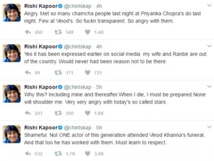 ""नव्या पिढीचा एकही अभिनेता वा अभिनेत्री विनोद खन्नांच्या अंत्यसंस्कारावेळी नव्हता ... हे लाजिरवाणं आहे... काहींनी तर त्यांच्यासोबत कामही केलं आहे... दुसऱ्याचा आदर करायला शिकलं पाहिजे... असं का? माझ्यावेळेसही कुणी खांदा देण्यास येणार नाही अशी मी स्वतःच्या मनाची तयारी करायला हवी....स्वतःला स्टार म्हणवून घेणा-यांचा आज खूप राग आला आहे... काल रात्री प्रियंका चोप्राच्या पार्टीमध्ये कितीतरी "चमचा" लोकांना भेटलो... इथे मात्र त्यातले काहीच जणं होते..."" असे सलग तीन ट्विट ऋषी कपूर यांनी केले. तर आणखी एका ट्विटमध्ये त्यांनी रणबीर कपूर देशाबाहेर असल्याने उपस्थित राहू शकला नसल्याचं स्पष्टीकरण दिलं.
