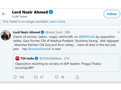 लॉर्ड नझीर अहमद हे ब्रिटीश संसदेचं वरिष्ठ सभागृह असलेल्या हाऊस ऑफ लॉर्डचे आजीव सदस्य म्हणून नियुक्त करण्यात आलेले पहिले मुस्लिमधर्मीय नेते आहेत. 'भाजपा नेत्यांचं एकापाठोपाठ एक निधन होत आहे आणि आता पुढचा नंबर नरेंद्र मोदींचा आहे', अशा आशयाच्या त्यांच्या ट्विटनं एकच खळबळ उडवून दिली आहे. भाजपा खासदार प्रज्ञा सिंह यांच्या 'काळ्या जादू'च्या विधानावर टिप्पणी करताना त्यांचा तोल सुटला आहे.