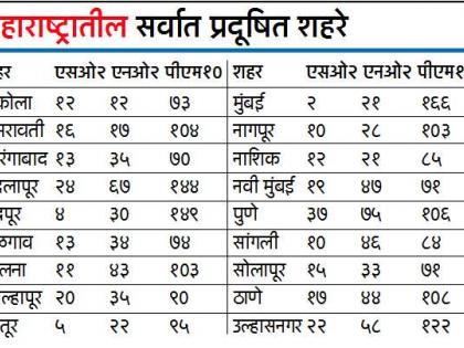 नायट्रोजन आॅक्साईड प्रति घन मीटर हवा २०१८ मध्ये सगळ््यात जास्त पुणे (७५), बदलापूर (६७) आणि उल्हासनगरमध्ये (५८) होती. धोकादायक वात कण पीएम १० सगळ््यात जास्त मुंबई (१६६), चंद्रपूर (१४९) आणि बदलापूरच्या (१४४) हवेत होते.