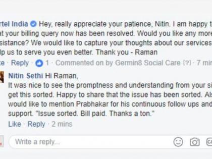 अखेर नितीन सेठी यांनी हा सर्व प्रकार फेसबूकवर शेअर केला. नितीन सेठी यांनी फेसबुकवर हा शेअर केल्यानंतर एअरटेलकडून दखल घेण्यात आली. तांत्रिक कारणामुळे ही चूक झाल्याचं कंपनीने मान्य केलं आणि दुरुस्त बिल दिलं. नितीन सेठी यांनी सामोरं जावं लागलेल्या न्यायलयात जाऊन दाद मागण्याचा निर्णय घेतला होता. मात्र त्याआधीच समस्या सोडवल्याने कोर्टाच्या पाय-या चढाव्या लागणार नाही आहेत.