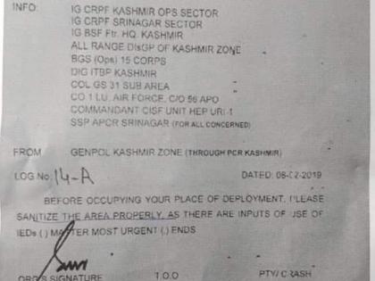 दरम्यान, दोन दिवसांपूर्वीच दहशतवादी संघटना जैश-ए-मोहम्मदने काश्मीरमध्ये आत्मघातकी हल्ल्याचा इशारा दिला होता, अशीही माहिती सूत्रांनी दिली आहे. हल्ल्या घडवण्यासंदर्भातील एक व्हिडीओदेखील जारी करण्यात आला होता. या व्हिडीओमध्ये अफगाणिस्तानमधील एका हल्ल्या दाखवला गेला, ज्यामध्ये स्फोटकांनी भरलेल्या वाहनाचा वापर करण्यात आला होता.