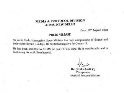 एम्सने दिलेल्या माहितीनुसार अमित शहांना कोरोनानंतरच्या उपचारासाठी दाखल करण्यात आले आहे. त्यांची प्रकृती चांगली असून त्याचे कामही ते हॉस्पिटलमधून करत आहेत. शहा यांना थकवा आणि अंगदुखी होत होती.
