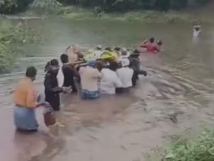 पाण्यातून जात असलेल्या या लोकांचा व्हिडीओ सोशल मीडियावर जोरदार व्हायरल होत आहे. चित्तूरच्या कस्तुरी नायडू कांड्रिगा येथे राहणारे शंकर (५३) यांचा मंगळवारी मृत्यू झाला. याच दरम्यान राज्यात अतिवृष्टीचा अंदाज हवामान खात्याने वर्तवला होता. अशा परिस्थितीत अंत्यसंस्कार करण्यासाठी कुटुंबाला कंबरभर पाण्यातून स्मशानभूमी गाठावी लागली.