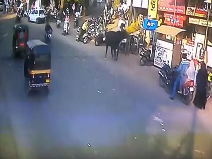 सुरुवातीला हा बैल रस्त्यावरून शांतपणे चालत होता. तो कोणावर हल्ला करेल, अशी कल्पनादेखील आजुबाजूच्या लोकांनी केली नसेल. त्याचवेळी काही अंतरावर पिवळ्या रंगाची साडी घातलेली एक महिला रस्त्यावरून चालत होती. हा बैल मागच्या बाजूचा रस्ता पार करून महिलेच्या पाठीमागे पोहोचला. काही अंतरावर असताना बैल अचानक आक्रमक झाला आणि त्याने जोरात धावत जाऊन महिलेला शिंगांवर उचलून हवेत फेकून दिले. ही धडक इतकी जोरदार होती की, महिला हवेत तब्बल पाच ते सात फूट उंचावर फेकली गेली आणि काही अंतरावर रस्त्याच्या कडेला जाऊन पडली. हा प्रकार पाहून आजुबाजूचे लोकही काही वेळासाठी घाबरले होते. परंतु, महिलेला धडक मारल्यानंतर बैल शांतपणे तसाच पुढे निघून गेला. त्यामुळे हा बैल अचानक थोड्यावेळासाठी इतका हिंसक का झाला, असा प्रश्न अनेकांना पडला.