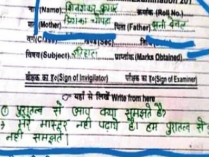 दुसऱ्या एका विद्यार्थ्याने उत्तरपत्रिकेत प्रेमात 'बेवफा' झाल्याबद्दल लिहिलं आहे. राम लखन सिंह यादव महाविद्यालयाच्या उत्तर पत्रिकेवर अभिनेता, अभिनेत्रींची नावे पाहिल्यावर तर अनेकांना धक्काच बसला. त्यावर रोल नंबर नाही आणि प्रश्नांच्या उत्तरांच्या रखाण्यात काहीही विचित्र गोष्टी लिहिल्या आहेत. व्हायरल कॉपीमध्ये विद्यार्थ्याचं नाव आदित्य कुमार, रोल नं-170, वर्ग- 12 लिहिण्याबरोबरच एका तरुणीचं नाव लिहिण्याबरोबरच आपलं प्रेम व्यक्त केलं आहे. व्हायरल होत असलेल्या उत्तर पत्रिकेत पुरातत्वबदद्ल प्रश्न विचारला होता, त्याखाली विद्यार्थ्यांनी लिहिलं की, आम्हाला शिक्षकांनी त्याबद्दल शिकवलं नाही.