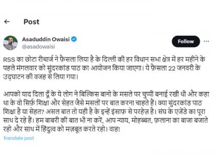 सुंदरकांड आयोजित करण्याच्या 'आप'च्या ताज्या निर्णयानंतर ओवेसी संतापले. या निर्णयाबाबत त्यांनी सोशल मीडिया प्लॅटफॉर्म X वर संताप व्यक्त केला. ते म्हणाले- आरएसएसच्या छोट्या रिचार्जने ठरवले आहे की दिल्लीतील प्रत्येक विधानसभा मतदारसंघात प्रत्येक महिन्याच्या पहिल्या मंगळवारी सुंदरकांड पाठाचे आयोजन केले जाईल. २२ जानेवारी रोजी राम मंदिरात प्राणप्रतिष्ठा सोहळा होत असल्याने निर्णय घेण्यात आला आहे.