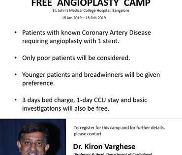 बंगळुरू - येथील सेंट. जॉन्स हॉस्पीटलमधील कार्डिओलॉजी विभागाचे प्रमुख डॉ. किरोन व्हर्गेसे यांनी गरीब रुग्णांवर मोफत अँजिओप्लास्टी करणार असल्याचे परिपत्रकच जारी केले आहे. दररोज एक याप्रमाणे 30 रुग्णांवर ही मोफत शस्त्रक्रिया करण्यात येणार आहे. गरिब रुग्णांसाठी खर्चिक असलेली ही शस्त्रक्रिया खासगी रुग्णालयात मोफत करण्यात येणार आहे हे विशेष.