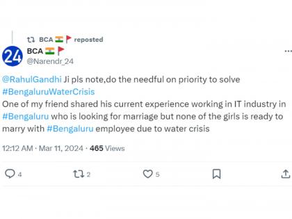 ट्विटरवरील पोस्टमध्ये नरेंद्र नावाच्या व्यक्तीने म्हटलं आहे की, "राहुल गांधीजी, कृपया बंगळुरूचं जलसंकट दूर करण्यासाठी प्राधान्याने महत्त्वाची पावलं उचला. बंगळुरूमध्ये आयटी उद्योगात काम करणाऱ्या माझ्या एका मित्राने अलीकडेच त्याचा अनुभव शेअर केला. तो म्हणाला. लग्नासाठी मुलगी शोधत आहे, पण बंगळुरूमध्ये जलसंकटामुळे कोणीही त्याच्याशी लग्न करायला तयार नाही."