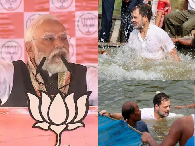 लोकसभेतील विरोधीपक्ष नेते तथा काँग्रेस खासदार राहुल गांधी यांनी काही दिवसांपूर्वी बेगूसरायमध्ये मच्छीमारांची भेट घेतली होती. दरम्यान, ते जवळच्याच एका तालावावरही गेले होते. तलावावर गेल्यानंतर, त्यांनी बोटीवरून पाण्यात उडीही मारली होती. यावेळी माजी मंत्री मुकेश सहनी त्यांच्यासोबत जाळेही टाकले होते. कन्हैया कुमार आणि काही मच्छिमारही त्यांच्यासह कमरेपर्यंत गढूळ पाण्यात उतरले होते. याचा व्हिडिओही सोशल मीडियावर जबरदस्त व्हायरल झाला. आता यावरून पंतप्रधान नरेंद्र मोदी यांनी शनिवारी राहुल गांधींना जोरदार टोला लगावला आहे.