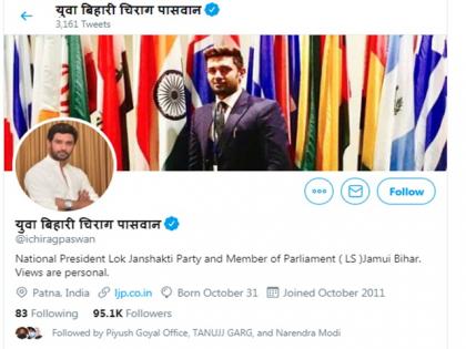 लोकसभा निवडणुकीच्या काळात नरेंद्र मोदी यांनी देखील आपल्या सोशल मीडिया अकाउंटवर नाव बदलून चौकीदार नरेंद्र मोदी असं केलं होतं. त्याचाच कित्ता आता चिराग पासवान गिरवत आहेत.